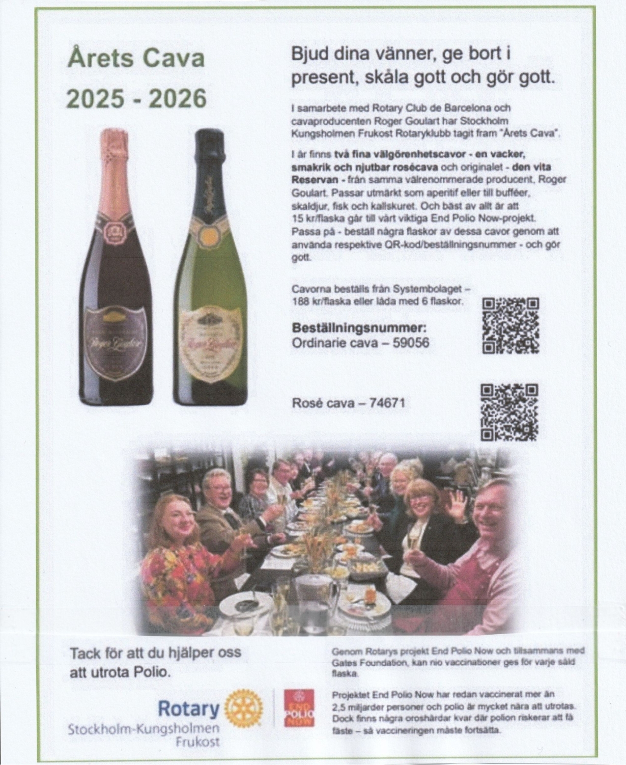 Ny laddning av Rotarys välgörenhetscava har kommit lagom till Påsk och inför vårens alla fröjder. Två versioner, den klassiska vita och en vacker rosé. En jättefin present att ta med sig - eller att njuta av till buffén.